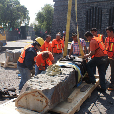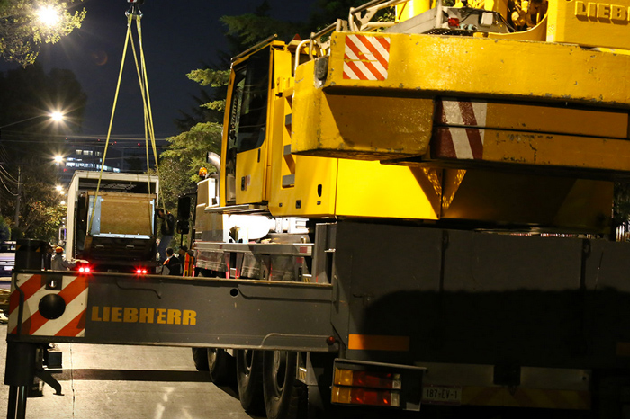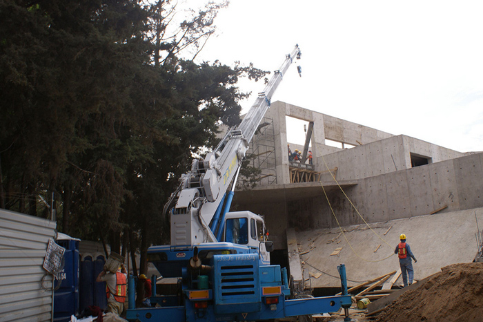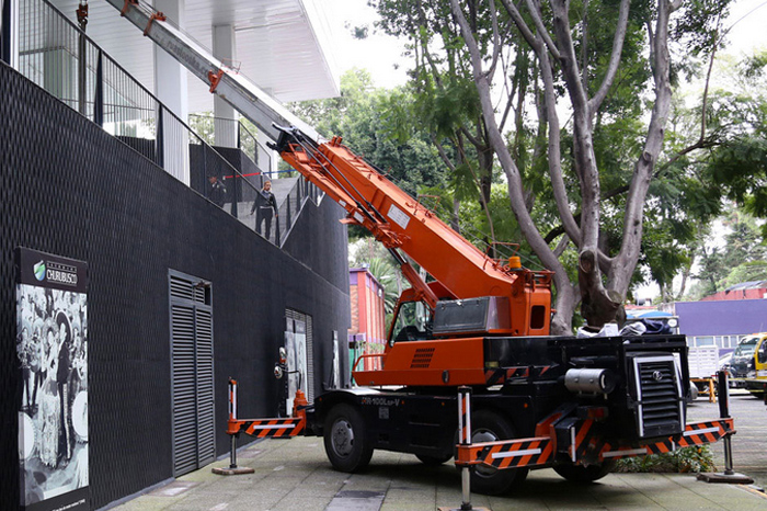 Grúa industrial Kato KR101, ensamblando a los gigantes de piedra. Exposición: “Naturaleza Humana”, Museo Anahuacalli