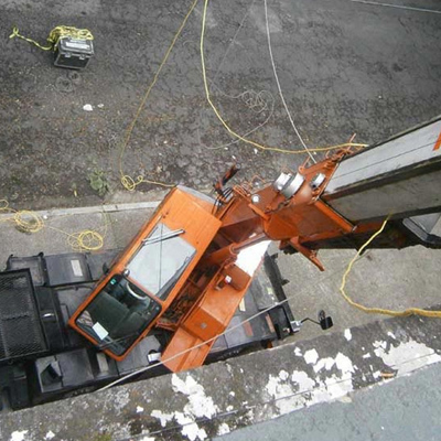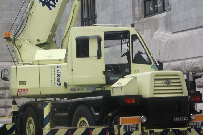 Grúa industrial Kato KR101-LII, elevando mini cooper en la Colonia Polanco, Mexico D.F.